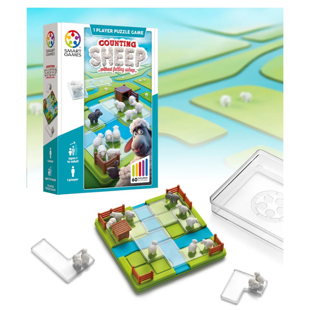 Compact game board with lid, 7 transparent puzzle pieces with 12 sheep and 1 ram, 1 puzzle piece with a shed, challenge booklet with 60 challenges and solutions, leaflet with game rules