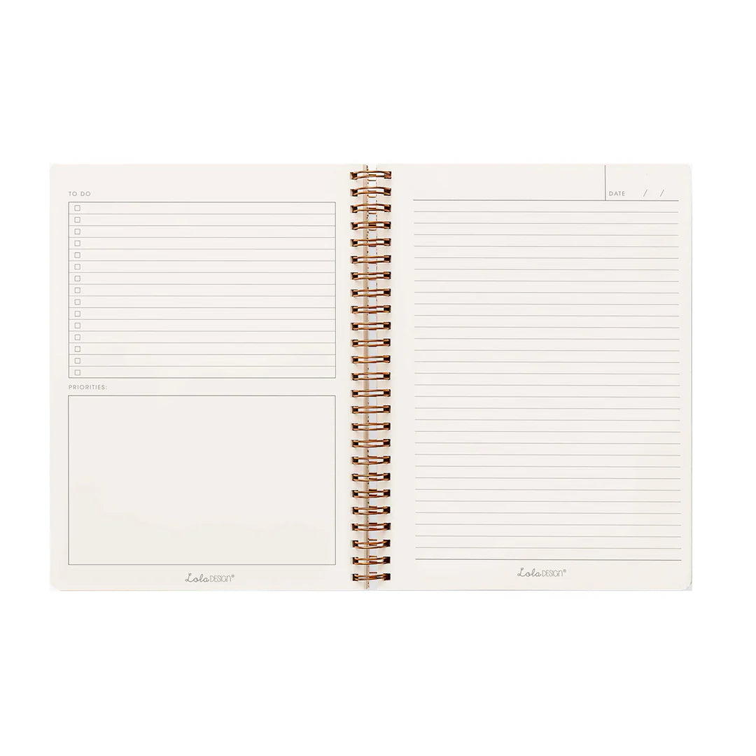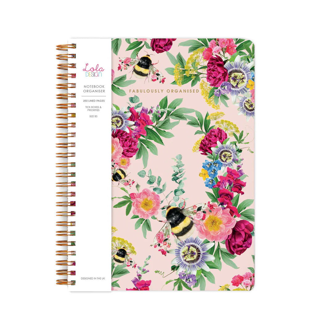 Stay fabulously organised with this beautiful B5 spiral bound botanical pink bee organiser notebook by Lola Design. This notebook features 250 lined pages, including a lined tick box and priorities section, perfect for keeping track of your daily tasks and to-dos.