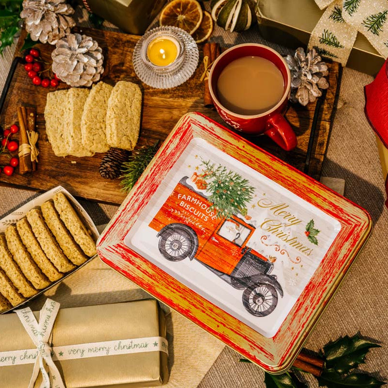 An embossed tin featuring the classic Farmhouse Biscuits van design, filled with our best-selling oat flip biscuits. Perfect for adding a touch of nostalgia to Christmas.