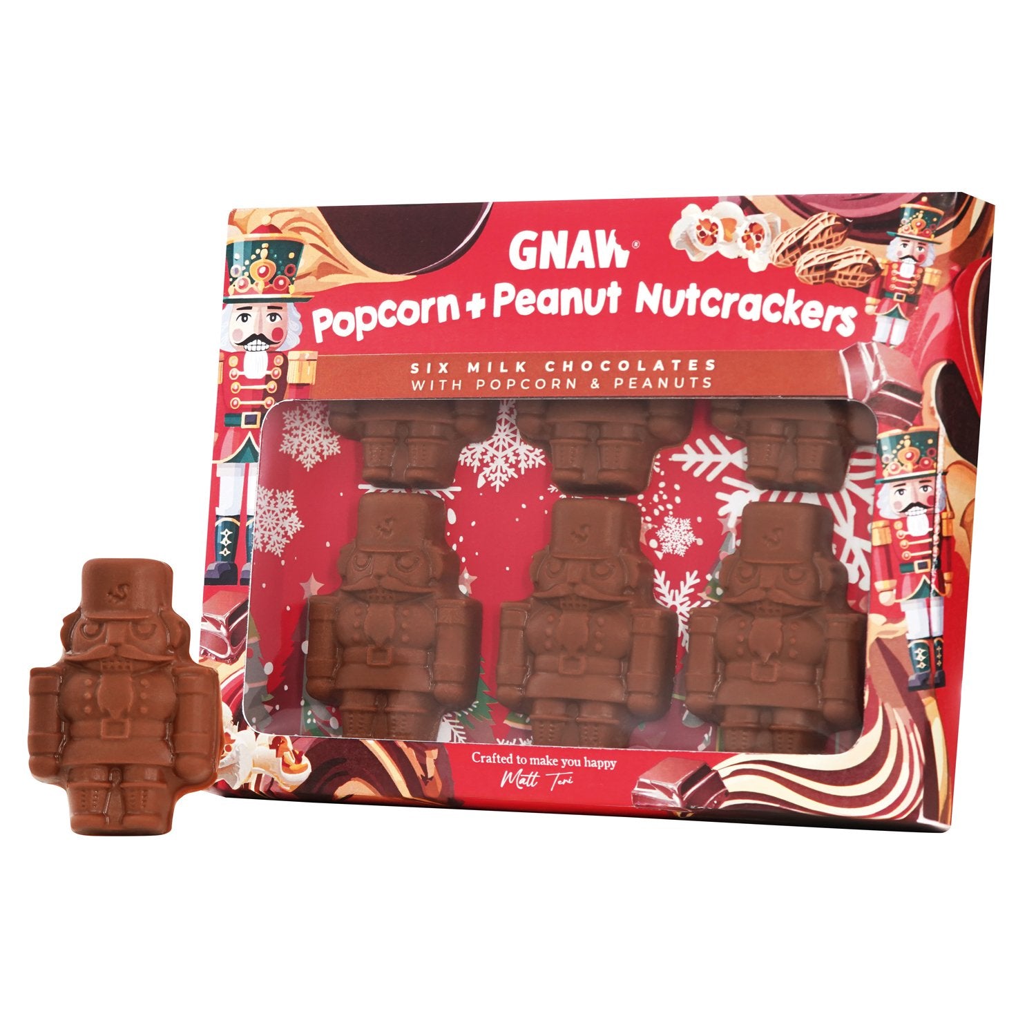 Six cute milk chocolate nutcrackers, flavoured with a satisfying popcorn flavour and the crunch of peanuts!