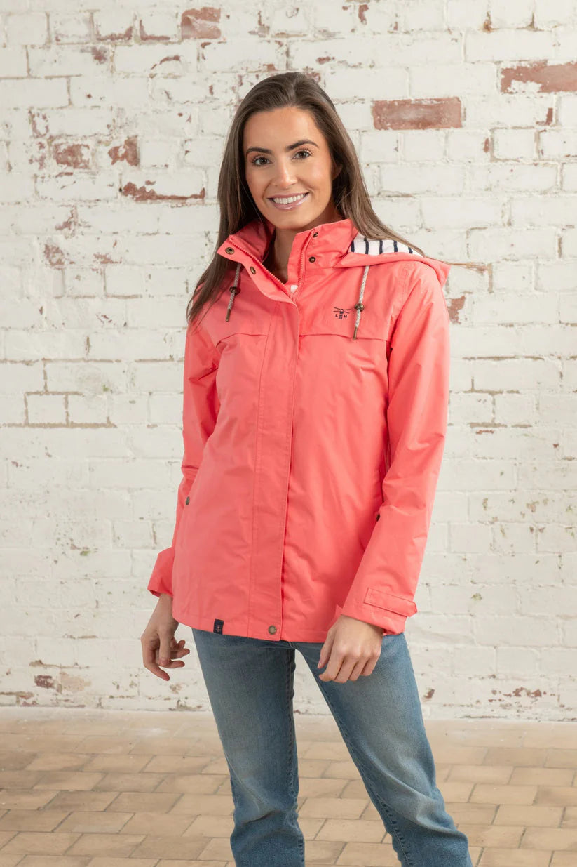 A 3/4 length waterproof jacket with soft jersey lining and hood.